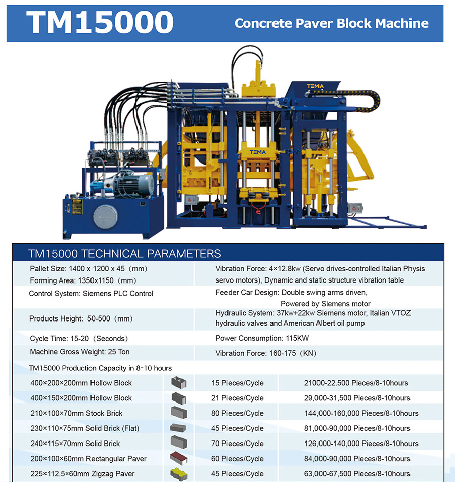 TM15000特大型砌块成型机是为工业级大规模生产设计的重型设备,采用四缸加压与多轴振动技术,单次可成型12块标砖或4块大型空心砌块。设备适配年产能1000万块以上的大型建材企业,支持24小时连续生产,是保障重点工程建材供应的核心装备。